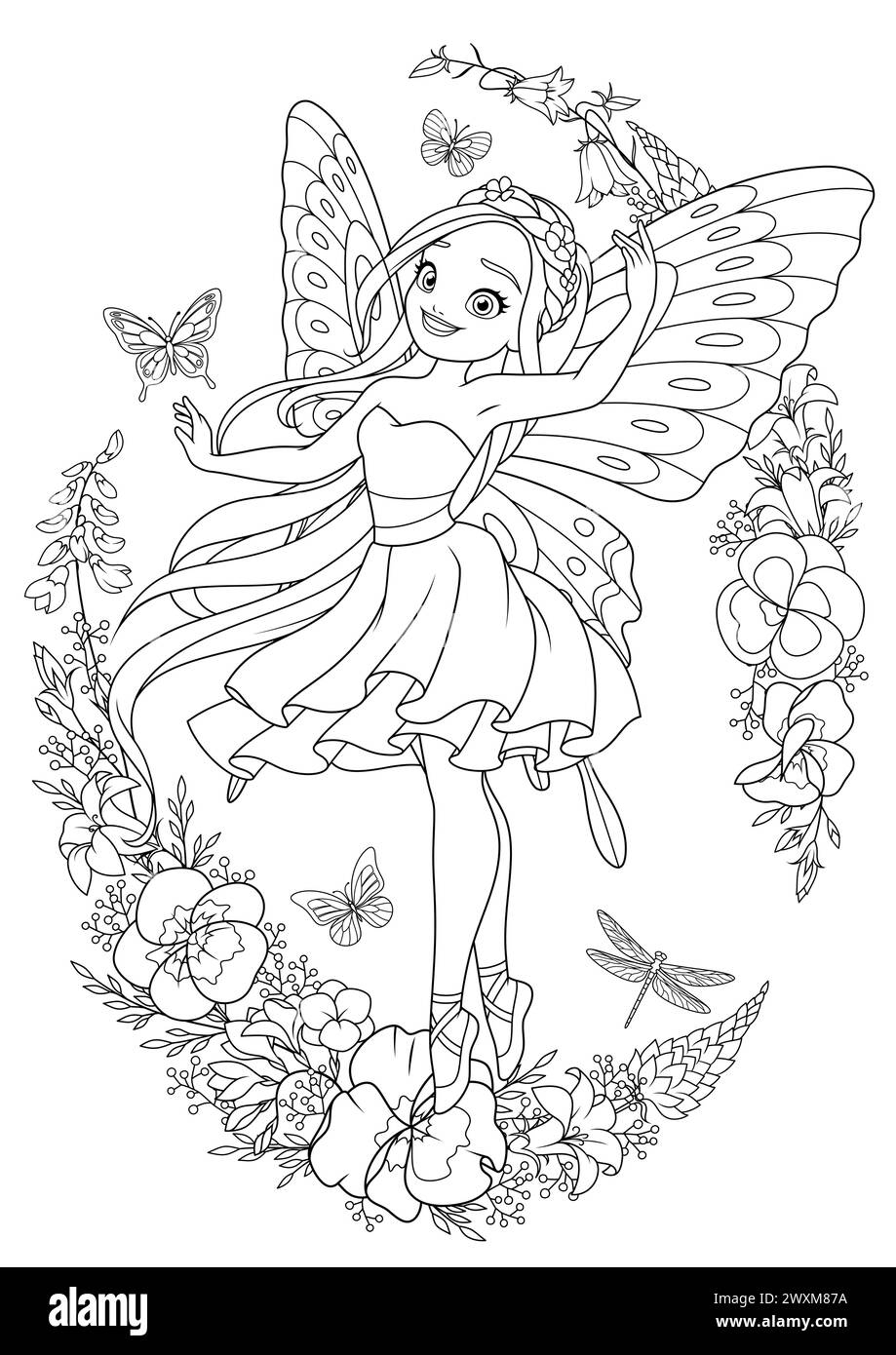 Cute Flying Fairy With Wings Surrounded With Butterflies And Flowers Vector Coloring Page Stock Vector Illustration Of Flower Beautiful 236575023