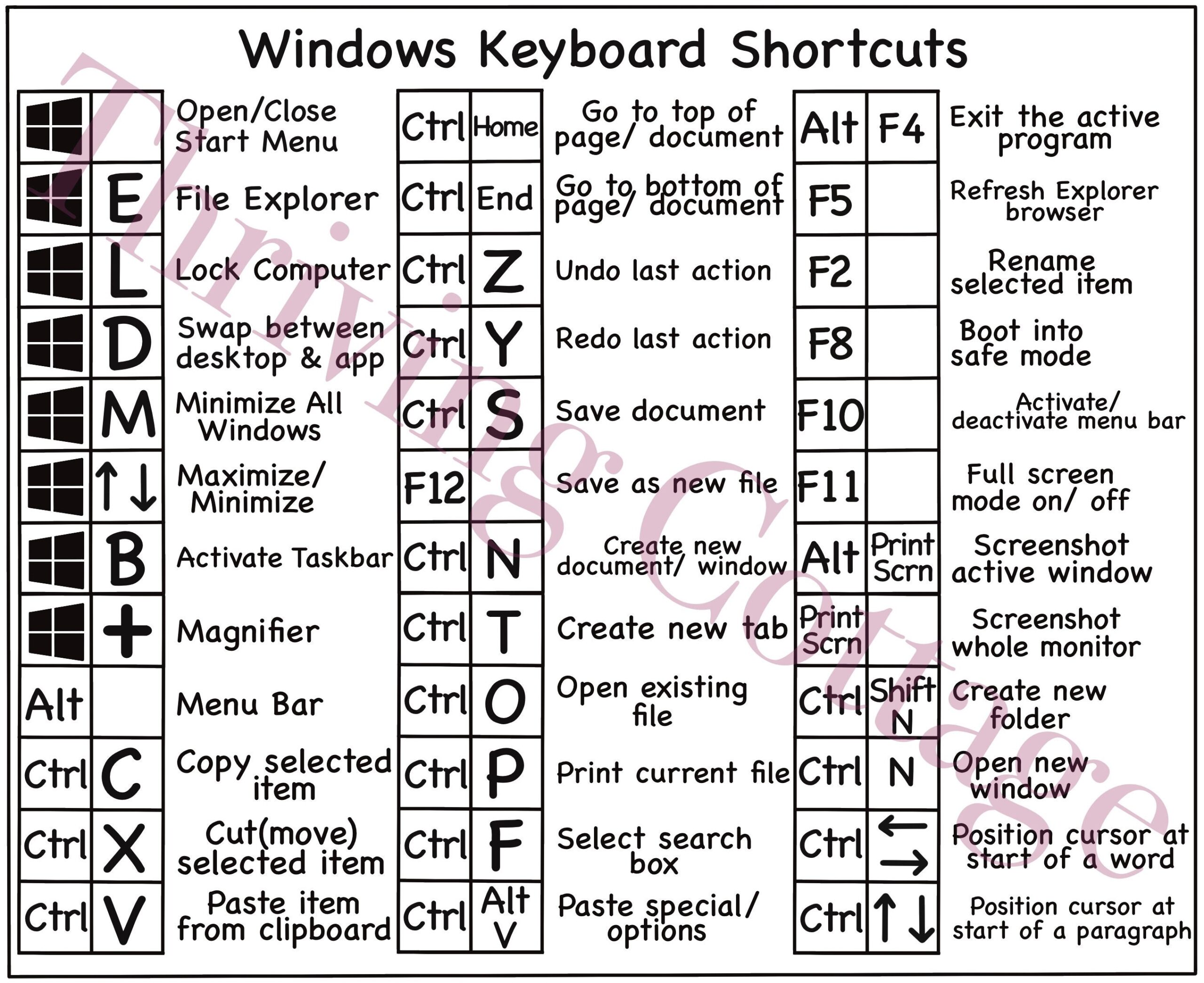 Printable Windows Keyboard Shortcuts Reference Guide Digital Pdf File Download Etsy