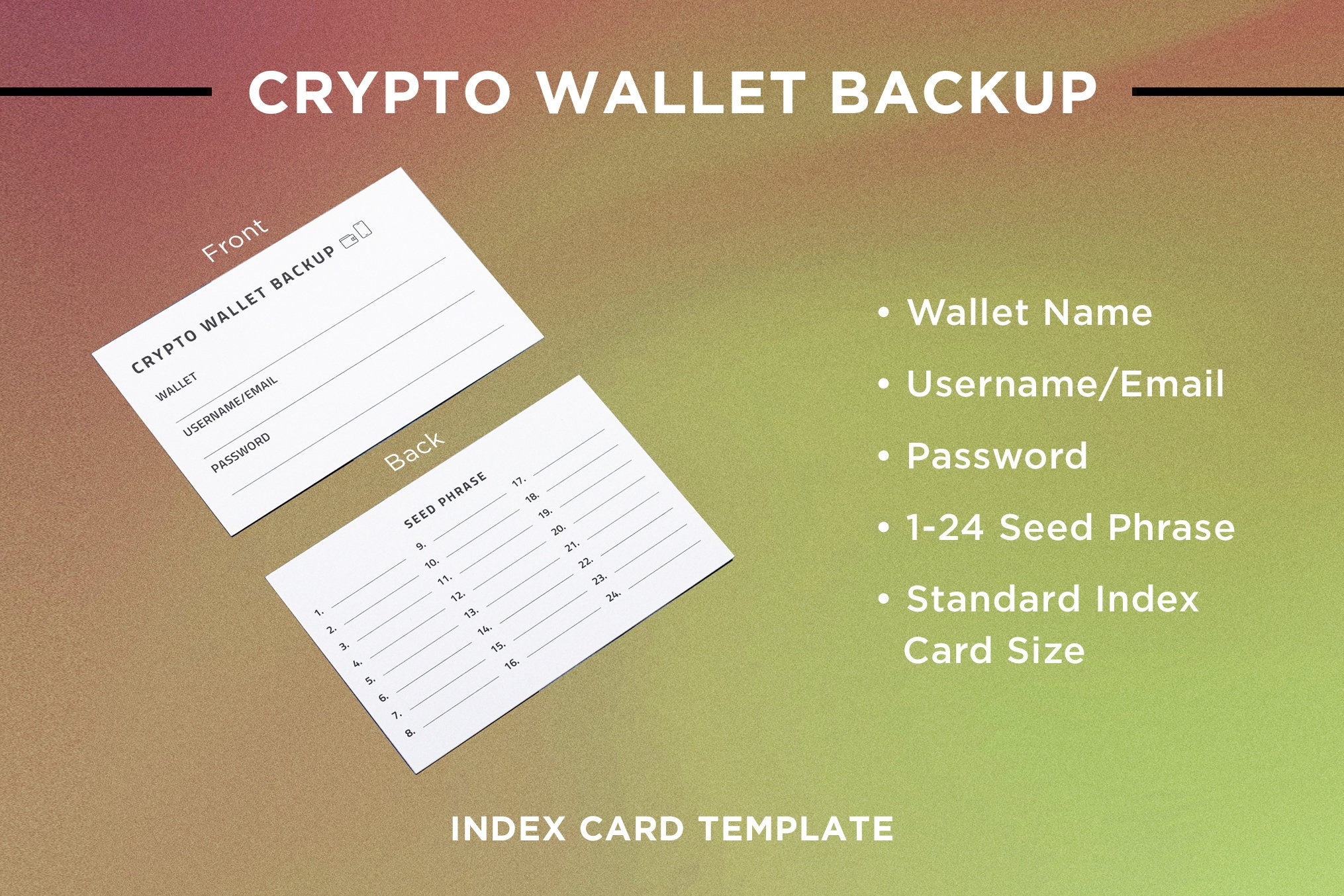 Crypto Seed Phrase Backup Index Card Printable 5 X 3 Template PDF Etsy