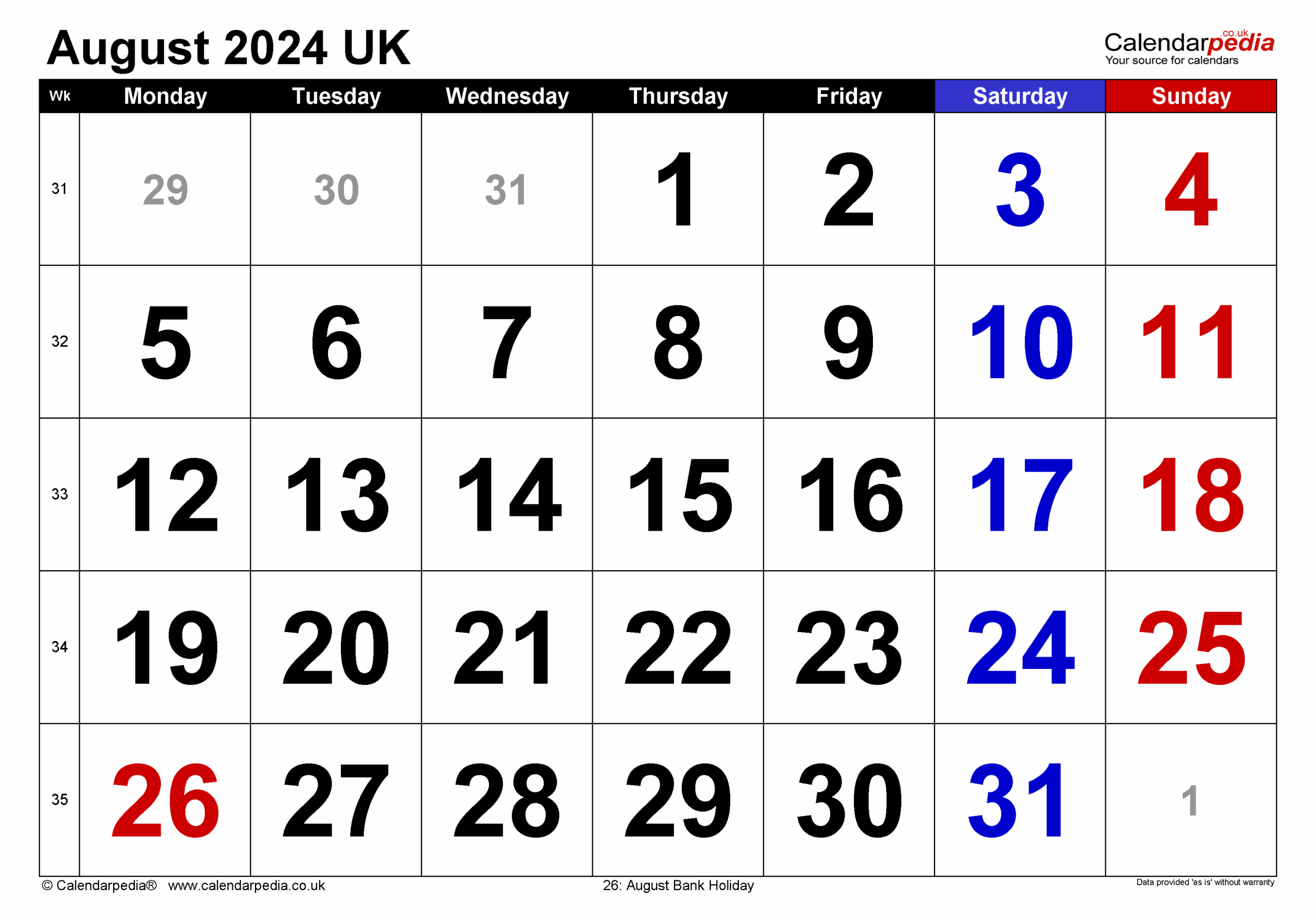 Calendar August 2024 UK With PDF Excel And Word Templates