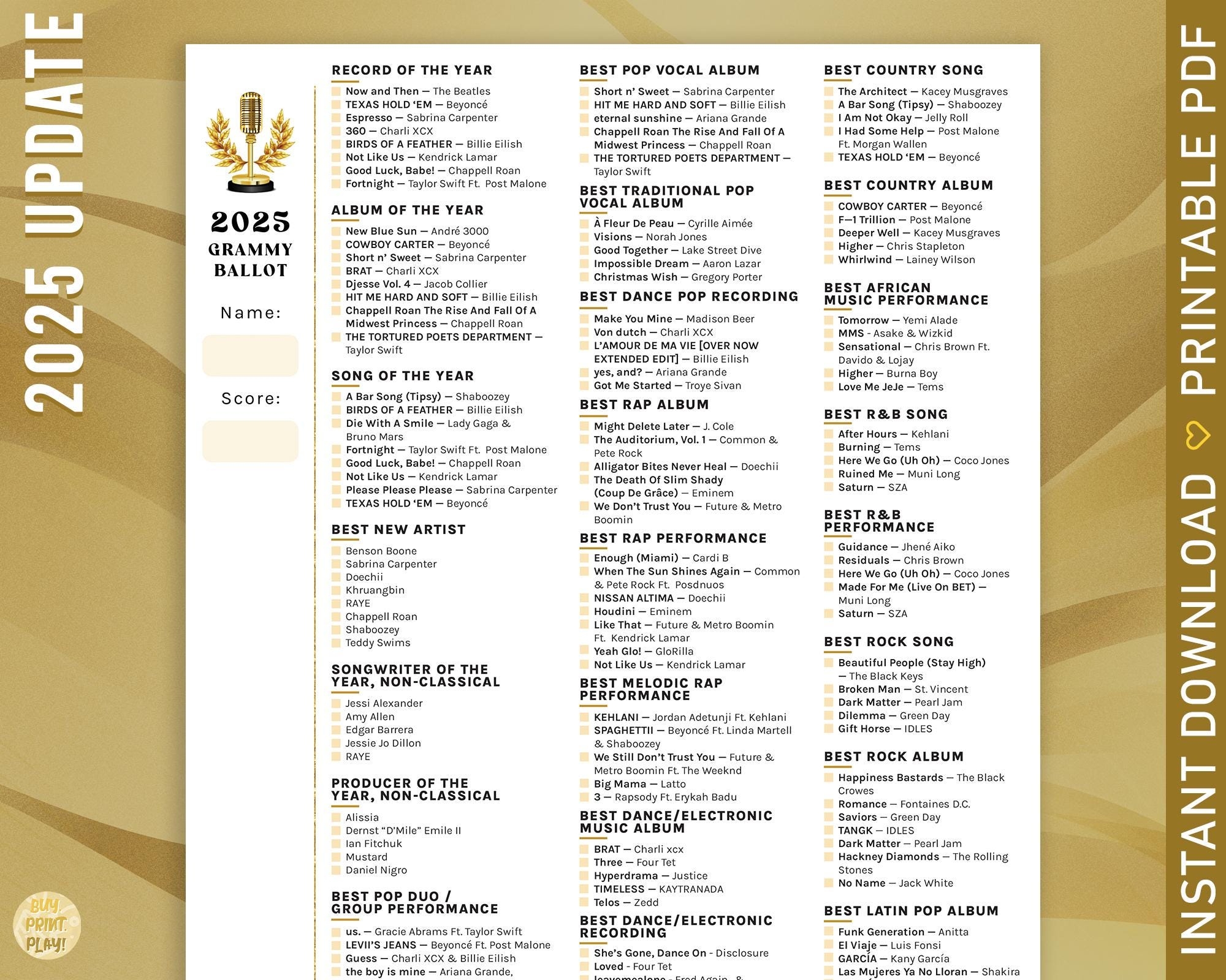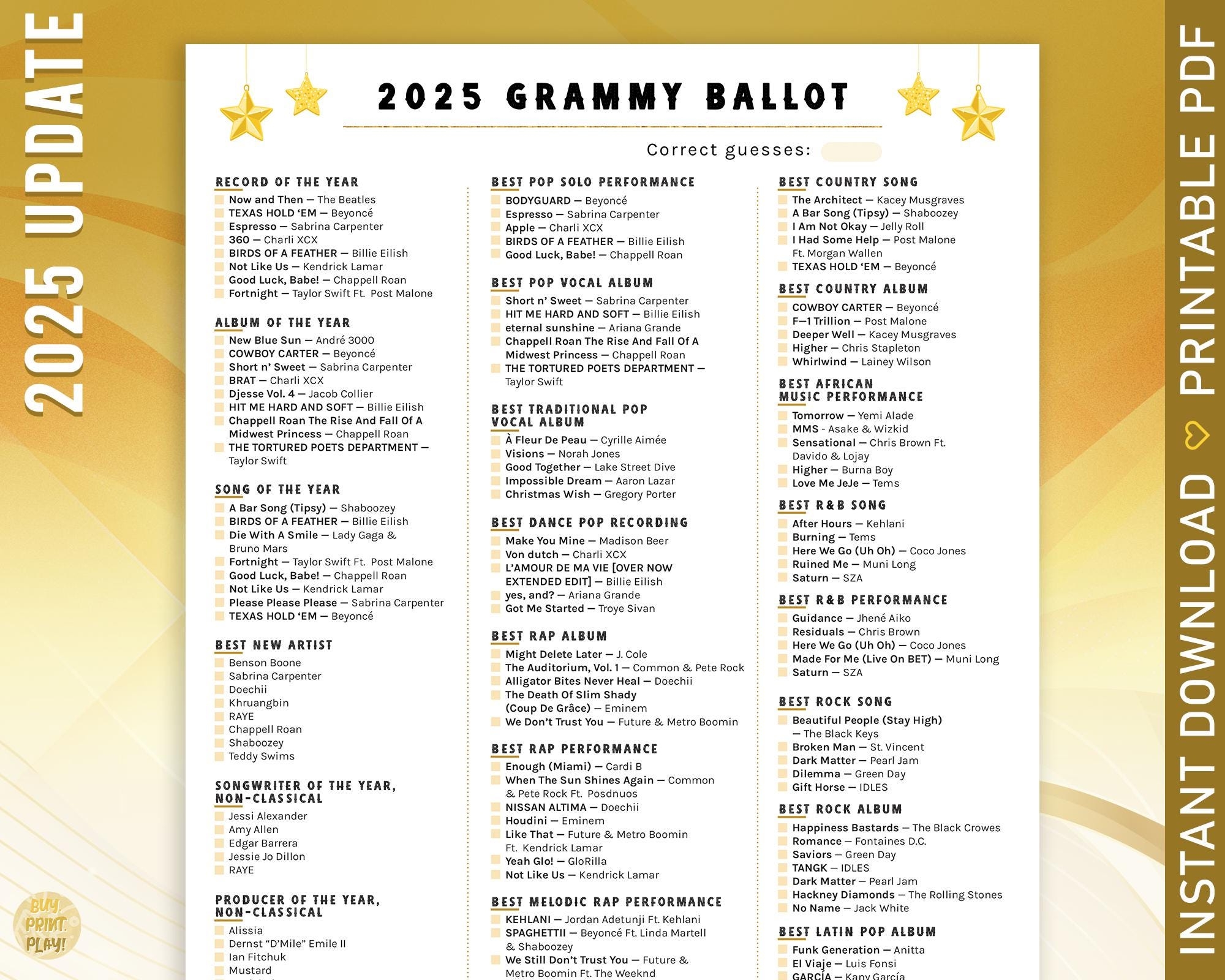 Printable 2025 Grammys Voting Ballot Predictions Game For Television Ceremony Music Academy Awards Watch Party With 26 Major Categories Etsy