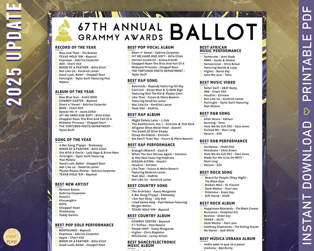 2025 Grammys Ballot With 24 Major Categories For 67th Music Awards Printable Predictions Voting Game For Academy Ceremony Watch Party Etsy