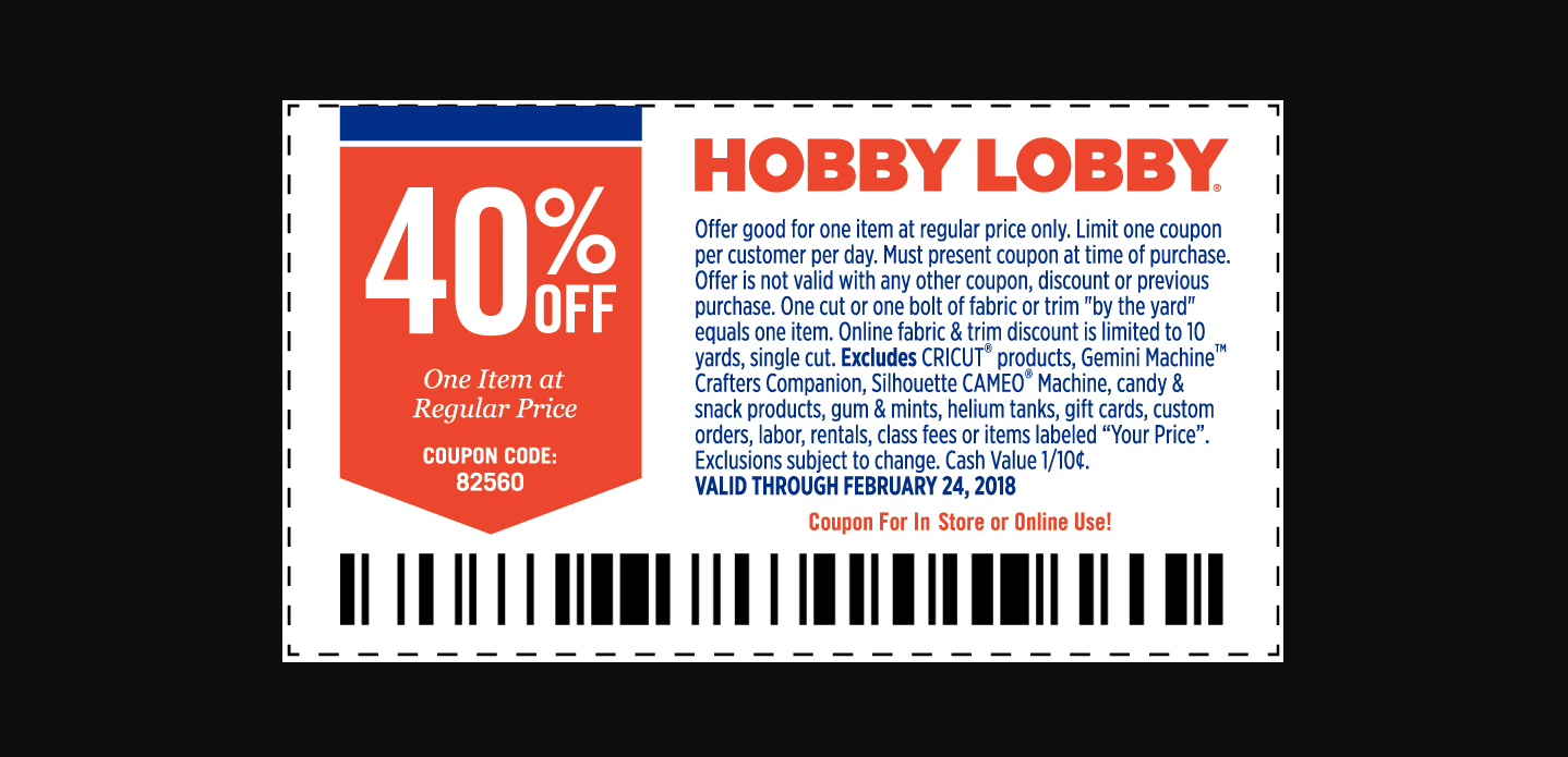 40 Off A Single Item At Hobby Lobby Or Online Via Promo Code 59041 Hobby Lobby July 2025 Coupons Promo Codes Deals