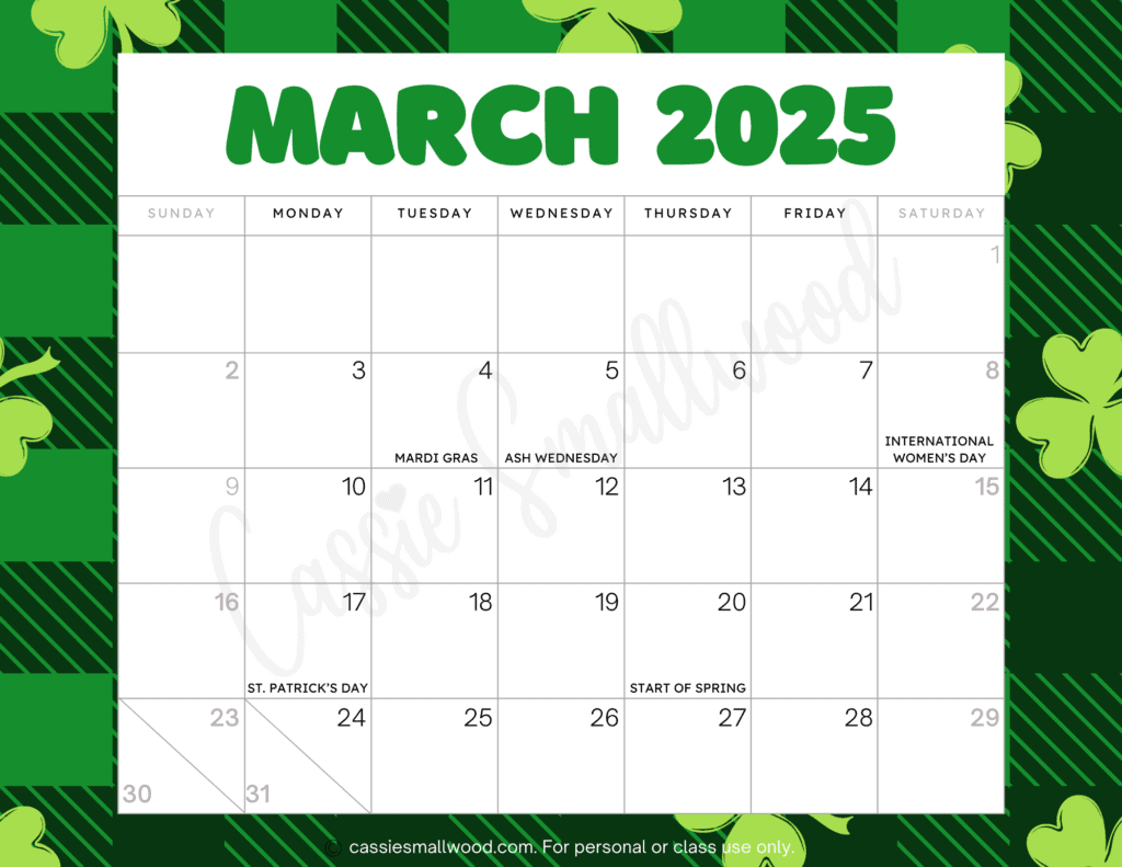 With our printable monthly calendar for March 2025, you can easily see all the holidays at a glance. From St. Patrick’s Day to the first day of spring, you’ll never miss a celebration!